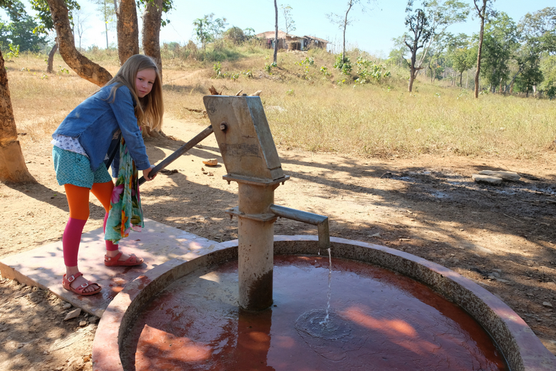 On the day of our visit, Parvati and her family proudly led us to one of the hand pumps, in the village centre. The pump draws the ground water which is safe to drink. It’s monitored and maintained by members of the community water committee. Parvati was telling us all about it, when I turned around to see her eldest daughter Dhriti showing Amelia how to use the pump – Amelia stepped in to try the pump whilst Dhriti ran to drink the water, conscious not to waste it.