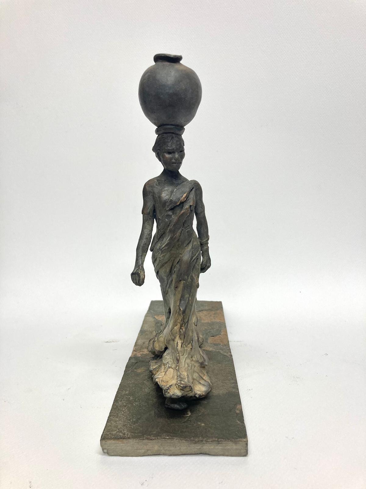 Sculpture by Rebecca Hawkins.  'Weight of the World’ depicts a strong woman, striding out purposefully, carrying an enormous pot on her head. Like all of us, these communities are reliant on water. However, water isn’t just available from a near-to-reach tap.