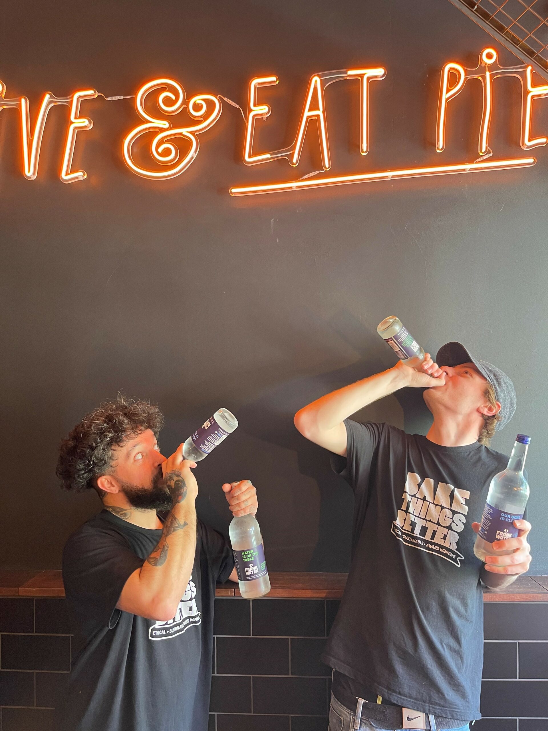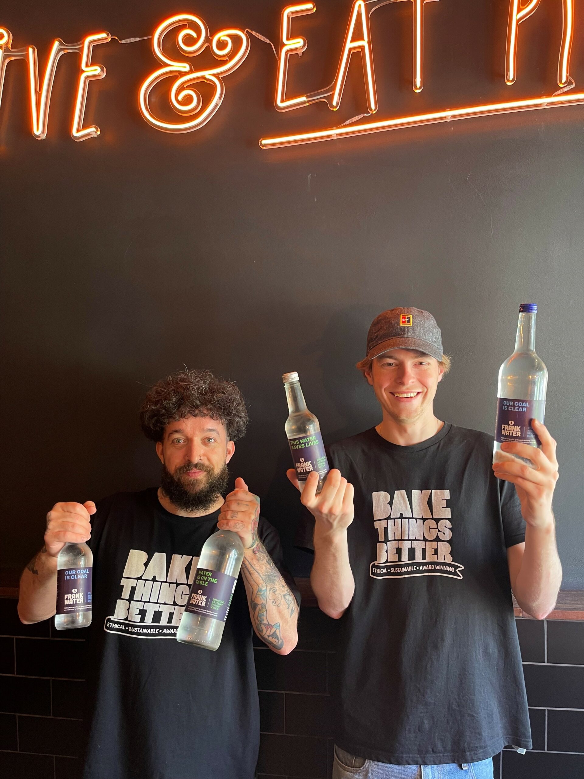 Poster boys Pete and Miguel work at Pieminister – one of our longest standing stockists and supporters (10 years and counting!). Not only do they stock our bottled water in their 15 restaurants across the UK, but they’re also signed up members of our Drink Me:Save Lives scheme – where customers make a small donation to Frank Water in exchange for unlimited tap water refills.