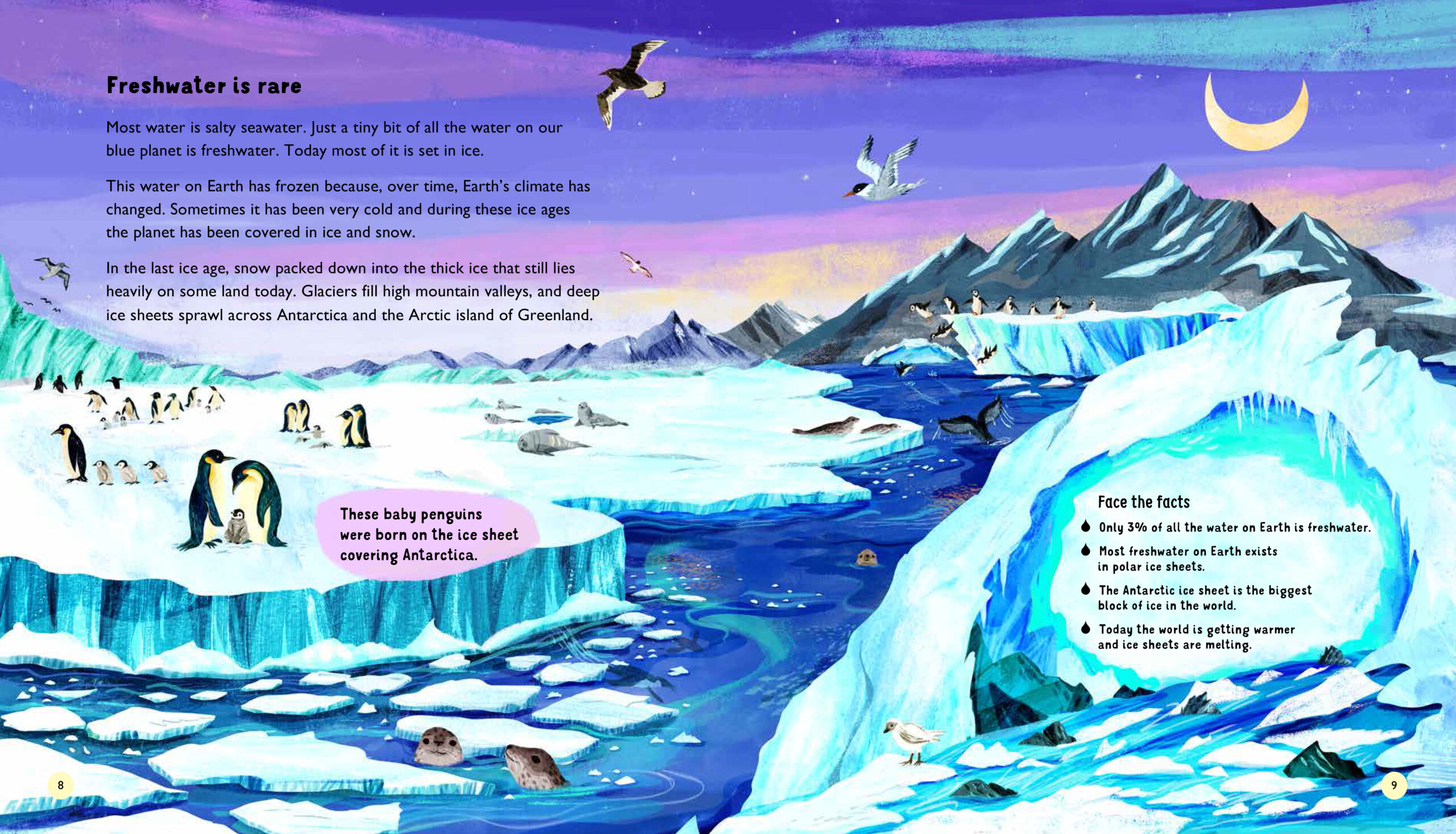 Writing WATER: Protect freshwater to save life on Earth, I wanted to paint a big picture. Starting with the first raindrops on Earth and culminating with our responsibility to value and share this precious resource. It is the United Nation’s Water Action Decade (2018-2028) – a perfect opportunity to talk about why water is news. Christiane Engel’s vibrant illustrations and charming characters engage children in scenes from the first water on Earth to the water cycle, life in freshwater habitats, pollution, climate change and using water wisely in this global story.
