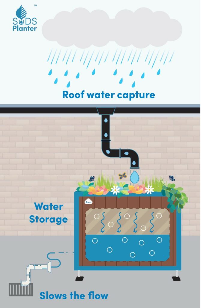 A: During dry spells, sudden heavy rainfall on hard, impermeable surfaces can overwhelm sewers and cause flooding or pollution. SuDSPlanters® capture and slow that water down, reducing the volume that hits the sewers all at once. Disconnecting downpipes into SuDSPlanters® or water butts is a simple but effective way to create extra sewer capacity and reduce flood risk.